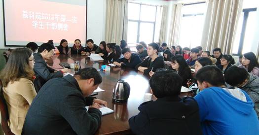 新的学期如期开课,2016年3月4日14:30教育科学与技术学院在综合楼1316召开了新学年第一次学生会会议。此次会议就新学期的工作安排以及学生工作的建制与创新等问题进行了热烈的讨论。学院党总支副书记陈剑光老师、学生党支部书记尹志老师和院团委书记卢晓芬老师作为指导老师参与会议。