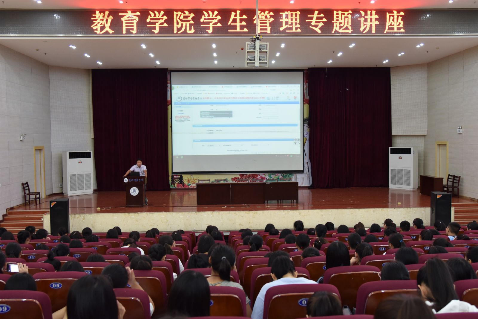 教育学院于2018年9月8日上午8点整在厚德楼学术报告厅召开学生管理专题讲座,出席此次讲座的有:教育学院副院长童三红、党总支副书记陈剑光、团总支书记卢晓芬、学生党支部书记尹志以及全体大一新生。