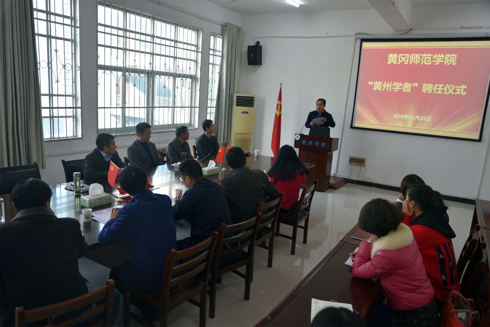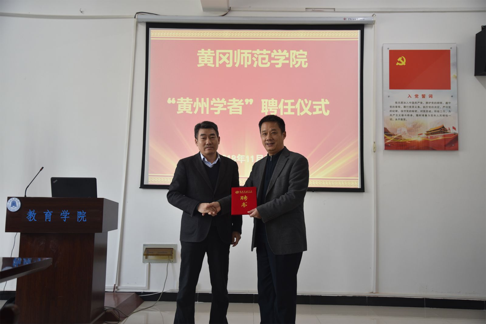11月23日下午,学校举行“黄州学者计划”聘任仪式,聘任河南大学杨捷教授为教育学院“黄州学者”。副校长马志斌出席并向杨捷教授颁发聘书。