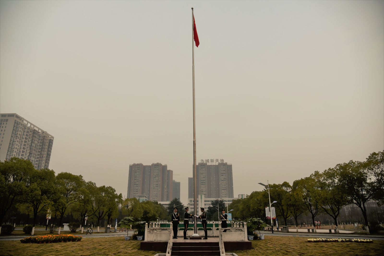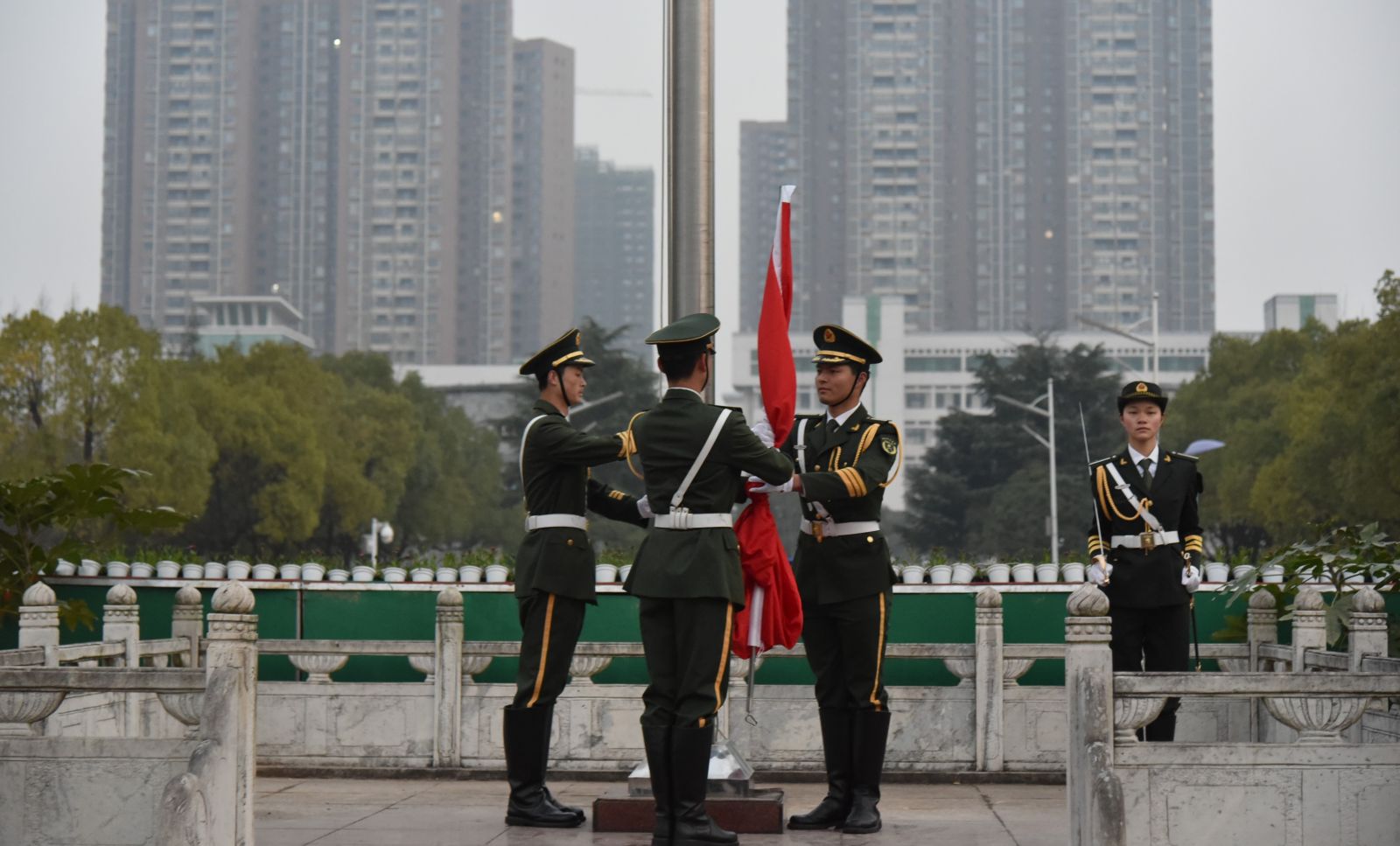 早晨六点十分,天色未明,同学们便早早起来,在旗台前列队等候。六点三十分,升旗仪式正式开始,英姿飒爽的国旗护卫队队员阵容整齐,步伐一致,精神抖擞。当国歌奏响,五星红旗冉冉升起,在场所有同学庄严肃立,目光都聚集在五星红旗之上。
