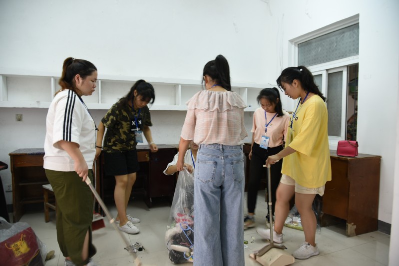 党员志愿者在打扫宿舍