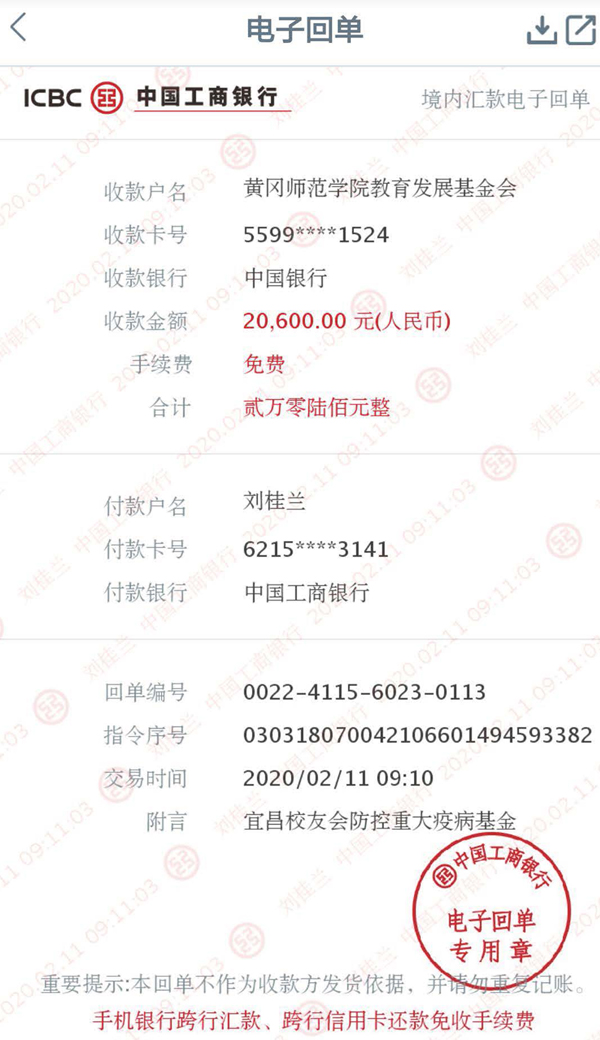 教育学院对口联系的宜昌校友分会于2月9日晚20:28在校友间发起捐赠倡议,计划募捐1.5万支援母校抗击疫情,2月10日18:30截止,在不到24小时之内累计捐款20600元,超额完成计划目标。会长、名誉会长、副会长个人捐款均超千元,校友们时刻心系母校,关注母校,在此新型冠状肺炎病毒肆虐之际,宜昌校友分会此举是对黄师深深的爱、满满的情,是对全体黄师人战胜疫情的精神支持与鼓励,黄师衷心感谢各位校友,母校的发展与每一位校友息息相关,荣誉与共。
