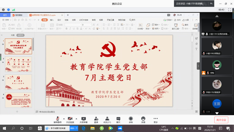 7月21日,学生党支部开展线上主题党日活动,此次活动由学生党员王苗、宋茜同志主持,学生党支部书记邹焱萍老师、全体学生党员参加会议。