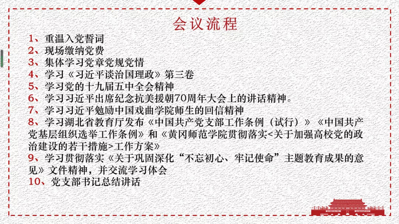会上,与会人员还认真学习了湖北省教育厅发布的《中国共产党支部工作条例(试行)》《中国共产党基层组织选举工作条例》和《英国上市公司365贯彻落实<关于加强高校党的政治建设的若干措施>工作方案》和《关于巩固深化“不忘初心、牢记使命”主题教育成果的意见》文件精神,并就此展开交流,分享学习体会。