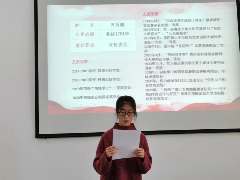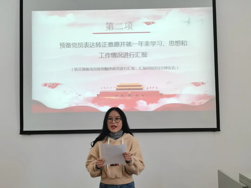 会议逐渐接近尾声,邹焱萍老师向转正的9名同志表示祝贺,同时也肯定了他们在过去一年的努力和付出。并希望他们今后能以党员标准严格要求自己,认真履行党员的义务,保持良好的风貌,继续发扬共产党员的先锋模范作用,以小我融大我,扎扎实实为党和人民建功立业。