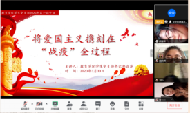 3月30日,为深入贯彻落实学校防疫工作各项要求,发挥党员先锋模范作用,增强青年学生理论学习的积极性和主动性,同时为保证疫情防控期间党课学习教育不断档、不掉线、不冷场,学生党支部通过线上视频会议的形式举行2020年第一期党课,会议由支部书记邹焱萍老师主持,全体学生党员参加。