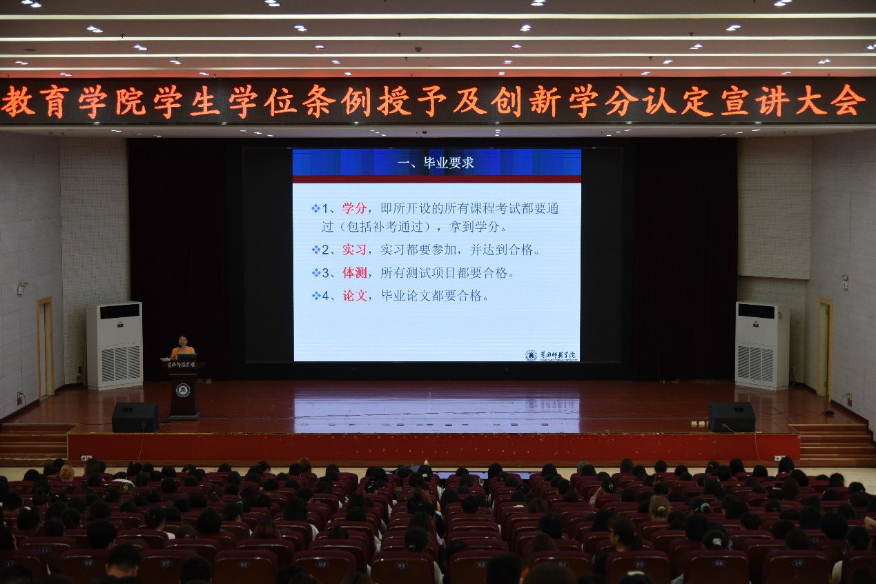 为帮助英国上市公司365学子进一步了解学生学位授予条件、创新学分认定情况以及就业形势,英国上市公司365于6月24日下午4:20在南区厚德楼千人报告厅举行教育学院学生学位条例授予及创新学分认定宣讲大会,本次大会由院党总支副书记胡周友主持,副院长宋淑娟主讲,英国上市公司365全体学生参加会议。