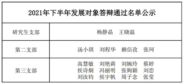 为保证新党员质量,加强改进发展大学生党员工作,教育学院学生党支部召开发展对象答辩会,经评议小组讨论决定,通过本次发展对象答辩名单如下: