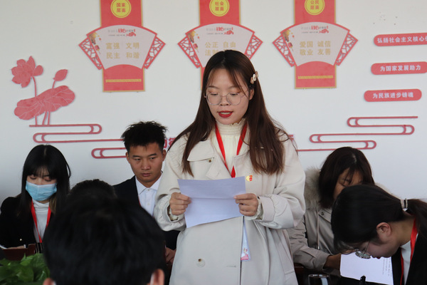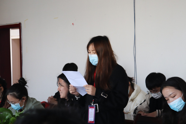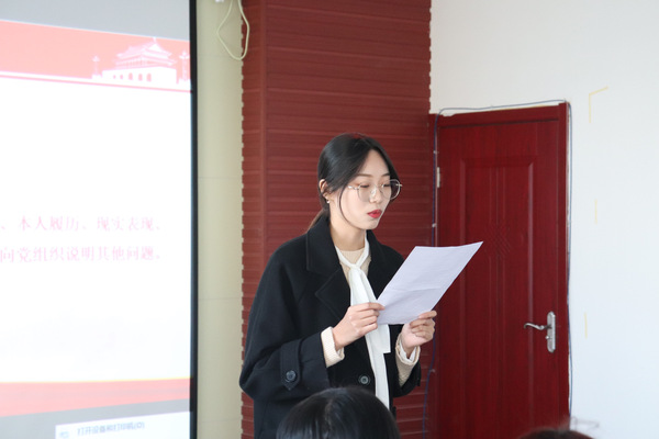 首先,邹老师报告出席会议的党员人数,提出会议的议题及会议的具体要求。会议正式开始,发展对象分别从入党的动机、对党的认识、本人履历等方面向党组织进行汇报,两位入党介绍人介绍发展对象相关情况,并对其能否入党表明意见。随后,与会党员进行讨论,采取无记名投票表决的方式进行表决。表决结束后,19位新发展预备党员分别向大会表达了自身存在的问题以坚定的入党决心,努力的向党组织靠拢。
