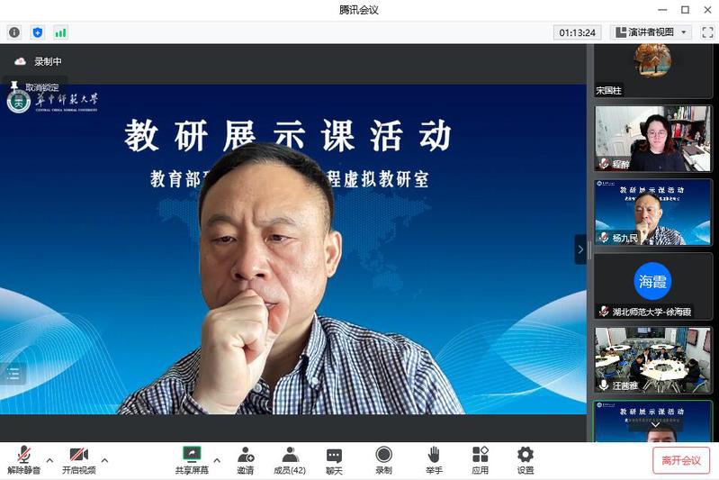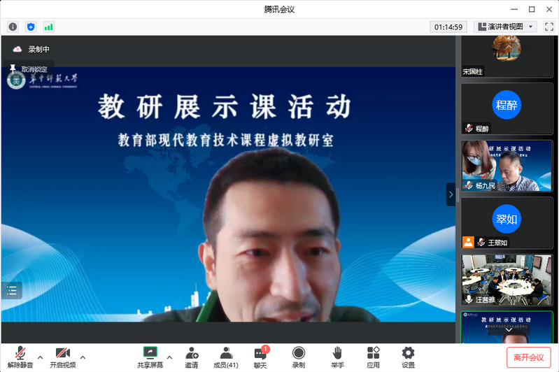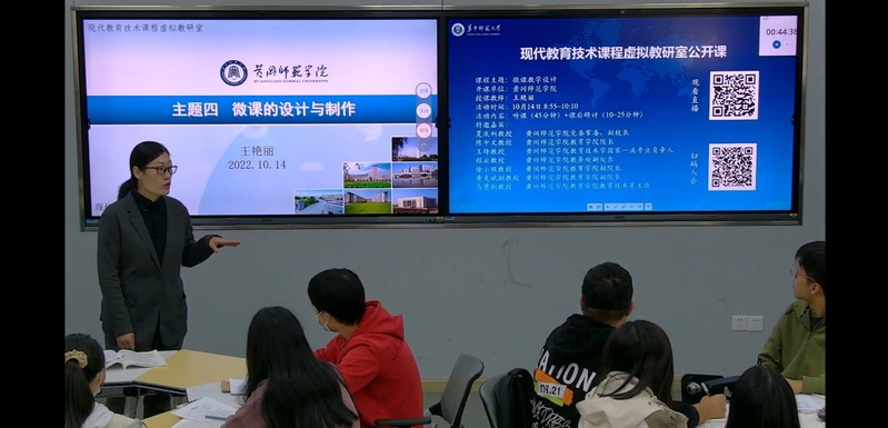 为进一步推动创新引领课堂教学变革,推进一流“金课”建设,10月14日上午教育技术学教研室成功举办教育部虚拟教研室公开课观摩与研讨活动。教育学院院长陈中文教授、副院长徐小双教授、副院长黄克斌副教授、教育技术学国家一流专业负责人王锋教授、教育技术系主任马慧副教授以及部分没课的专业教师全程参加线下听课和研讨活动。教育部现代教育技术课程虚拟教研室负责人、国家教学名师、华中师范大学杨九民教授,以及华中师范大学、东北师范大学、河北师范大学、河南大学、广西师范大学等30余所开设现代教育技术课程高校同行共同参加了线上听课及研讨交流活动。会议由教育部现代教育技术课程虚拟教研室骨干成员、华中师范大学李文昊教授主持。