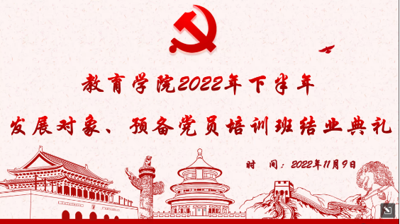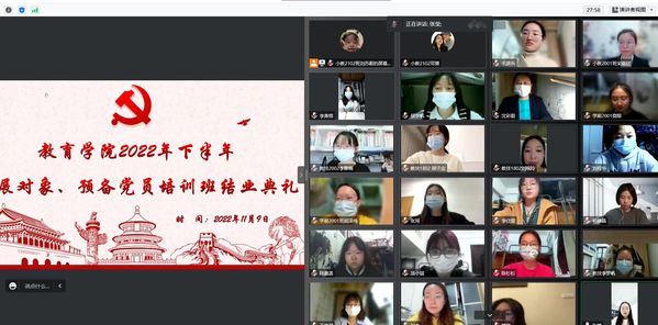 为总结教育学院2022年下半年发展对象、预备党员培训班的学习经验,推动培训班学员将所学理论与实际相结合,教育学院学生党支部于11月9日晚19:00在腾讯会议举行2022年下半年发展对象、预备党员培训班结业典礼,培训班全体学员参加本次结业典礼。本次结业典礼由教育学院学生党支部助理刘苏毅主持。