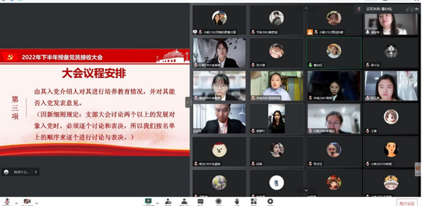 11月13日晚20:00,教育学院学生第一党支部在腾讯会议召开2022年下半年预备党员接收大会。教育学院党委副书记王永胜、学生第三党支部书记邹焱萍、学生第一党支部书记钟秀娟、支委陈剑光及杨洛出席本次会议,学生第一党支部学生党员及5名发展对象参加会议。本次会议由学生第三党支部书记邹焱萍主持。