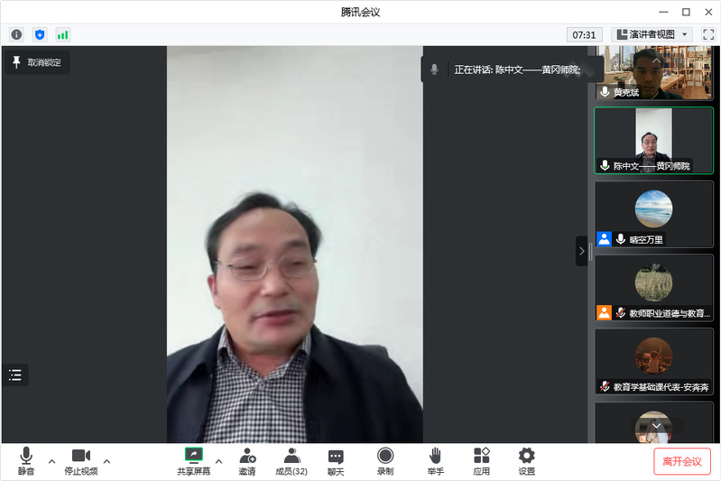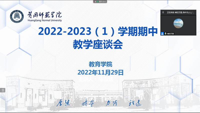 11月29日下午,教育学院在线举行2022-2023学年第一学期期中教学座谈会。院长陈中文教授、分管本科教学工作副院长黄克斌、教育技术系主任马慧、学前教育系主任路雪、小学教育系主任沈胜林、教师教育课程教研室主任代朝霞和教学办王飞飞老师参加会议。黄克斌主持会议。