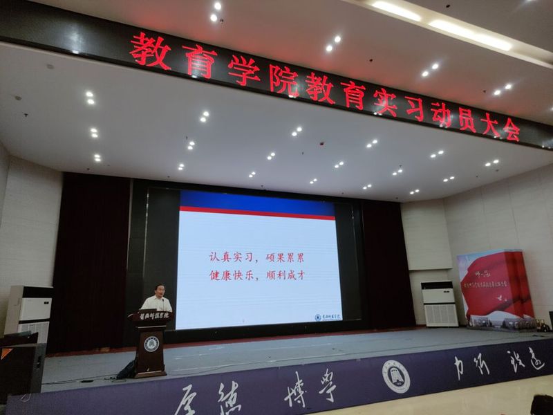 6月17日,教育学院在厚德楼学术交流中心召开2023届毕业生教育实习动员大会。院长陈中文及学院班子全体成员、实习带队教师、校内实习指导教师以及教育技术学、学前教育、小学教育三个本科专业的329名学生参加了动员大会。大会由分管实习工作的副院长徐小双教授主持。