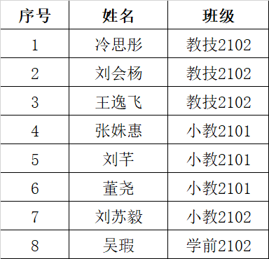 根据《中国共产党发展党员工作细则》等相关规定,教育学院学生第一党支部于2023年5月18日召开预备党员接收大会,讨论冷思彤等8名同志的入党问题。大会采取无记名投票方式进行了表决,表决结果符合党员发展要求。大会认为,冷思彤等8名同志已基本具备了党员条件,同意接收为预备党员。现予以公示,名单如下: