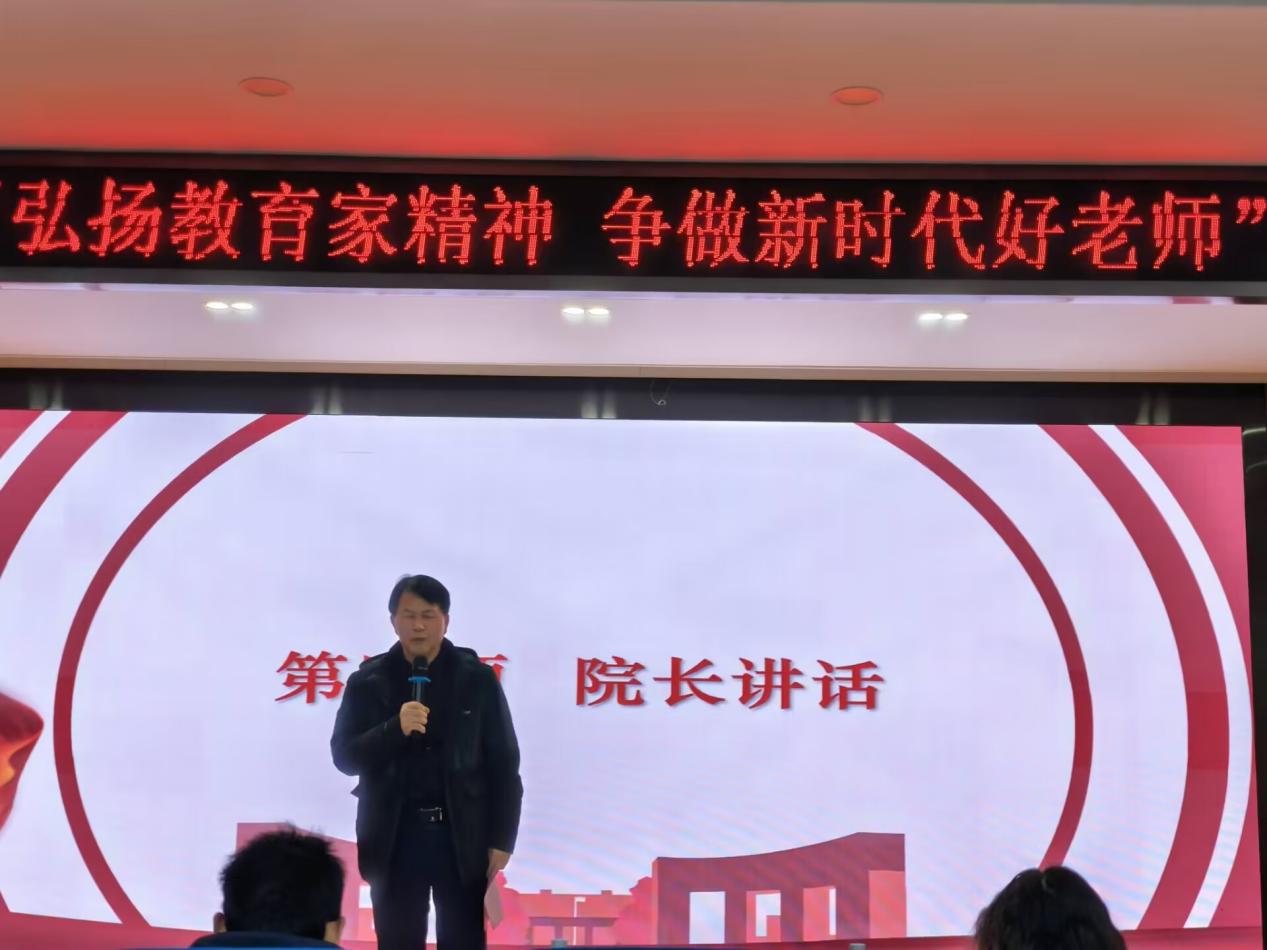童院长发表总结讲话。他对本次“弘扬教育家精神,争做新时代好老师”主题演讲比赛给予了充分肯定和高度评价。童院长指出,此次比赛不仅为同学们提供了展示自我的平台,更在校园中营造了浓厚的教育氛围,展现了同学们对教育家精神的深刻理解与追求。他热情鼓励同学们要再接再厉,不断磨砺自己,在未来的学习与生活中持续进步,并期待大家明年能够继续积极参与到此类活动中来,共同书写教育理想的新篇章。