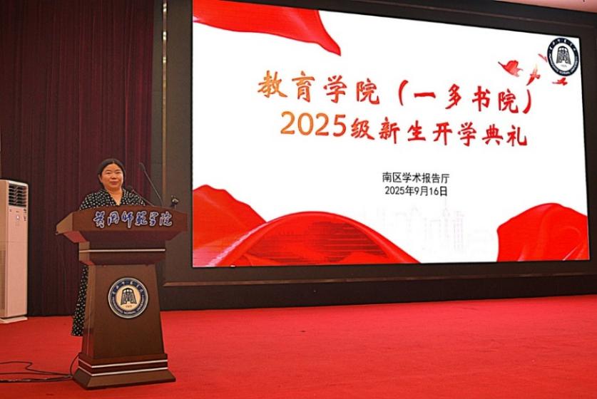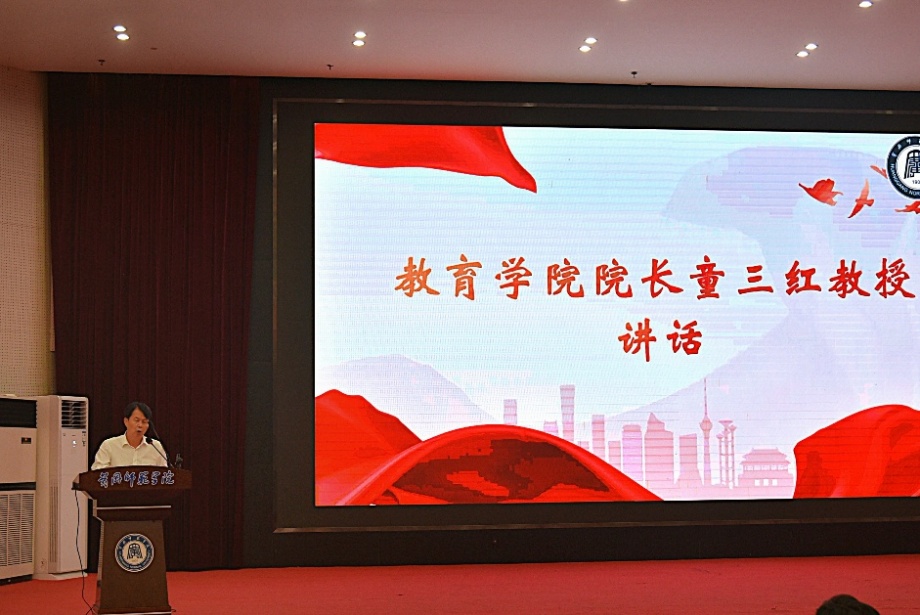 院长童三红讲话,他围绕“龙头学院、规模第一、层次最全、生源最优、就业率高”向新生介绍了学院的亮点特色。他寄语新生重新定位身份,明确教育使命;主动适应变化,拥抱教育创新;合理规划未来,迈向幸福教育人生。