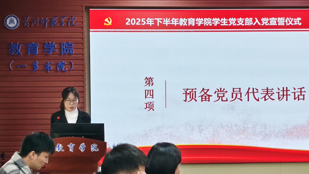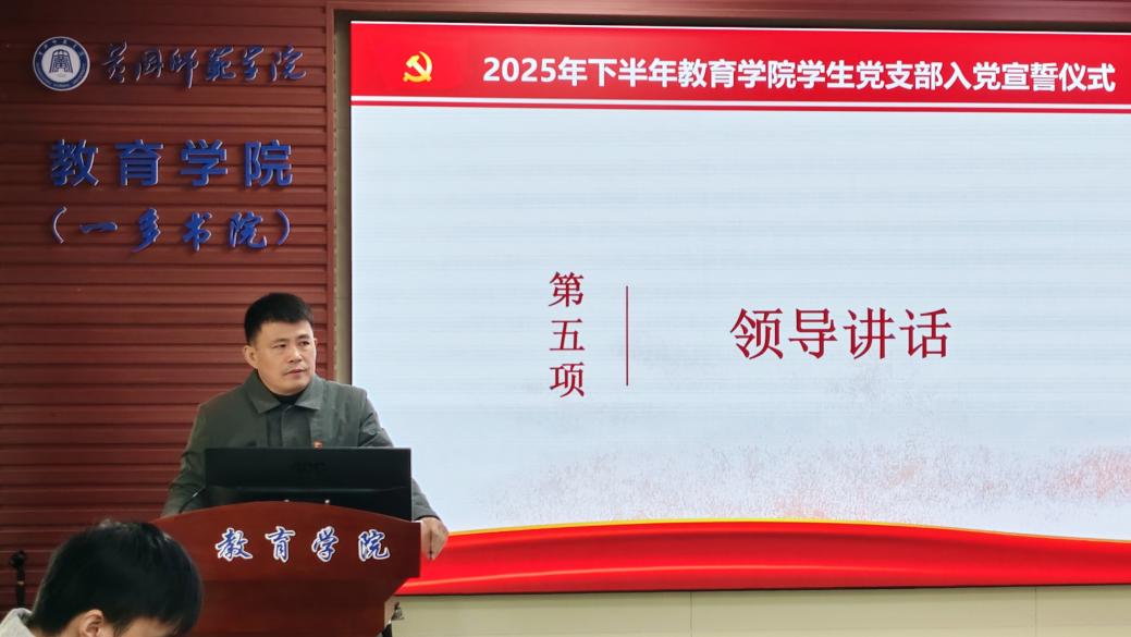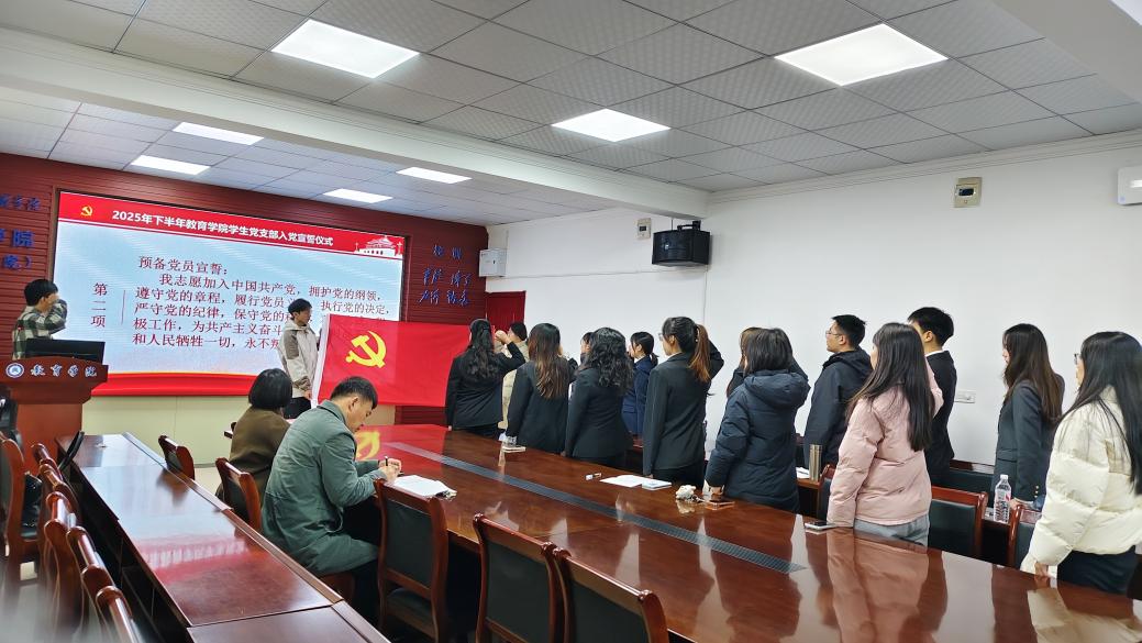 为进一步加强党员党性教育,激励新党员坚定理想信念,12月4日中午,教育学院(一多书院)学生党支部2025年下半年新发展党员入党宣誓仪式在致远楼616会议室举行,学院党委书记钟劲松、党委副书记徐丹、学生党支部书记宋雄伟以及全体新党员参加此活动。仪式由学生党支部书记宋雄伟主持。