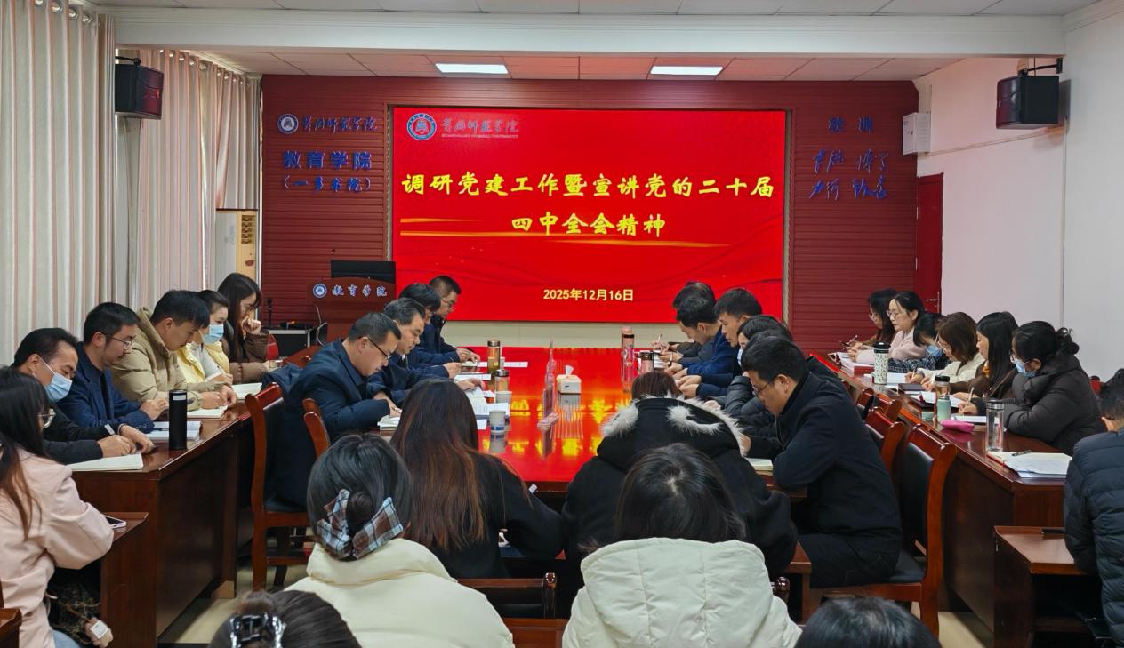 12月16日上午,校党委书记陈向军、副书记王基家、组织部常务副部长周俊飞、学校办公室副主任王锋一行来我院开展党建工作调研并宣讲党的二十届四中全会精神。教育学院党委书记钟劲松、院长程云、党委副书记徐丹、副院长徐小双、黄克斌、韦耀阳、院长助理沈胜林和全体教师党员、研究生党员参加会议。会议由钟劲松主持。