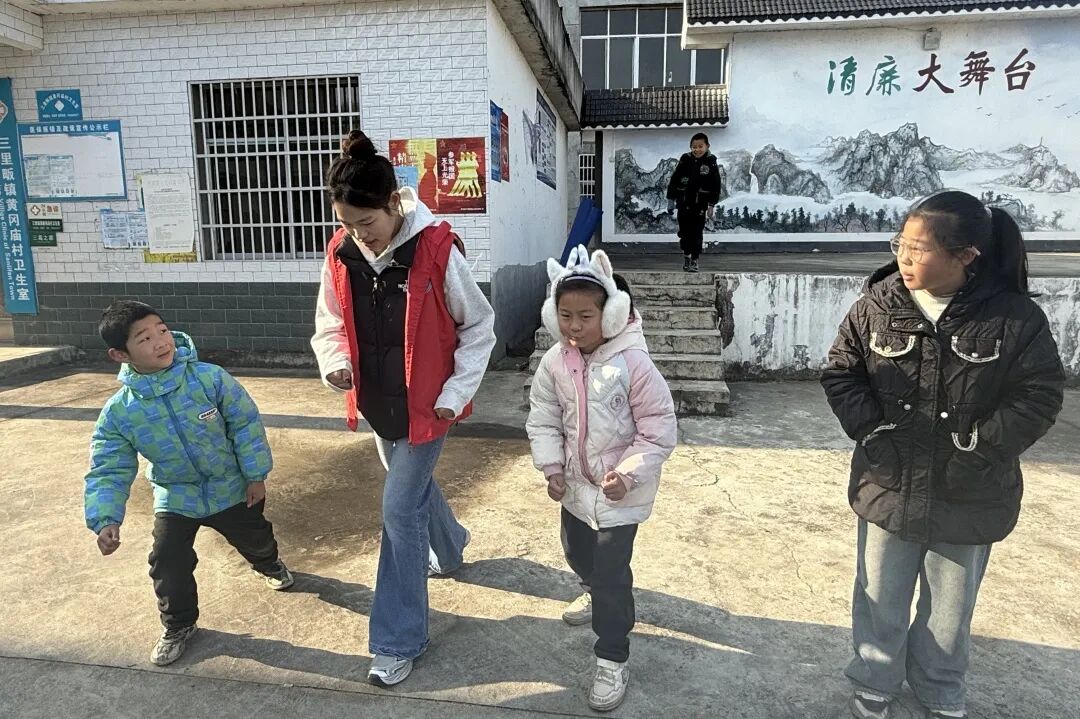 理论讲解结束后,大家移步户外,开启了舞蹈教学环节。冬日的寒风挡不住孩子们高涨的热情,志愿者化身“舞蹈导师”,在空地上分解示范动作:抬手、踮脚、旋转……孩子们在志愿者的耐心指导下,从生涩模仿到逐渐跟上节奏,尽情释放着活力,欢快的音乐声和孩子们的笑声交织在一起,成为了冬日乡村最动听的乐章。