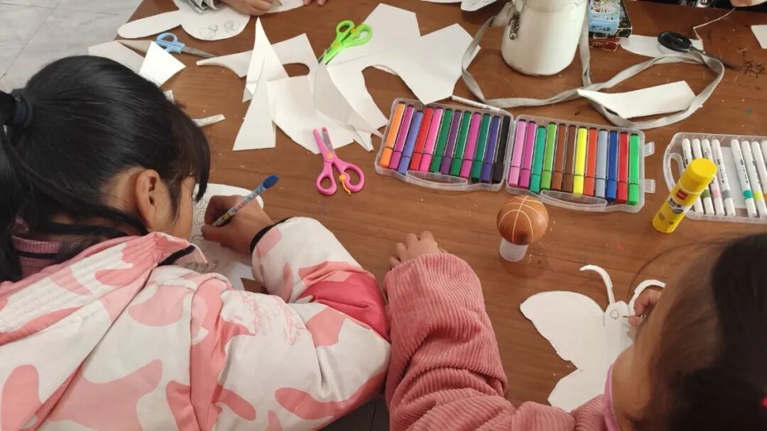最令人期待的制作环节到来。孩子们领取材料包,在志愿者的指导下,开始创作属于自己的独一无二的纸鸢。课堂上只剩下画笔与纸张摩擦的沙沙声、偶尔的低声交流与老师巡回指导的温柔提醒。这段时间里,专注与想象在笔尖流淌,空白纸鸢逐渐被色彩与愿望填满。