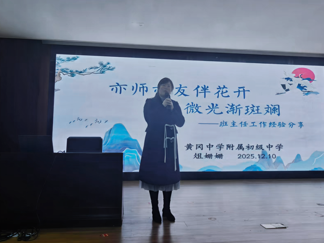 俎姗姗老师以“亦师亦友伴花开,一束微光渐斑斓”为主题,借PPT展开分享。她先提出班主任需备“责任心、宽容心、公平心、爱心、细心”的“五心法宝”,又引陶行知名言,强调要站在学生立场共情。
