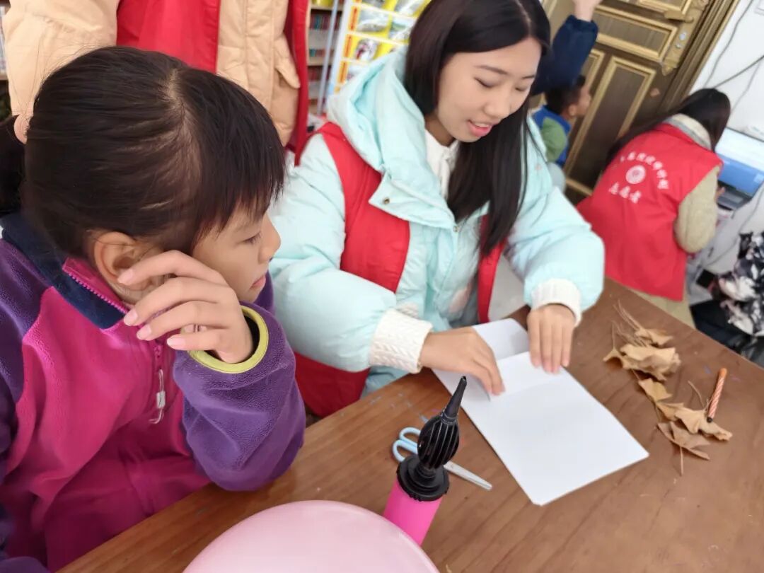 “折、剪、绕、粘”,志愿者们手把手教起了纸翻花和扭扭棒花束,有人给纸翻花画上了“专属花纹”,有人把扭扭棒编成了“小灯笼”,在志愿者老师的帮助下,小朋友们捏出了圆滚滚的“非遗小作品”,在热火朝天的创作时间里,教室飘满了欢声笑语。