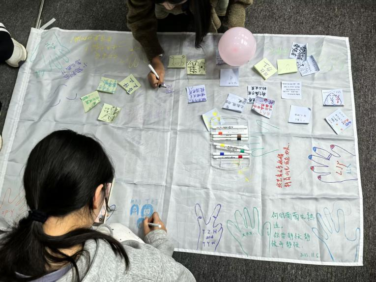 压轴登场的“心灵涂鸦墙”环节温馨治愈。主持人分发便利贴与彩笔,同学们用色彩与文字记录心情与感悟,将“期待”“温暖”“加油”等积极词汇与可爱图案贴满墙面。这面充满创意的“心灵涂鸦墙”成为情感表达的“树洞”,也搭建起无声的交流平台,让同学们在创作中释放情绪,在分享中获得共鸣。