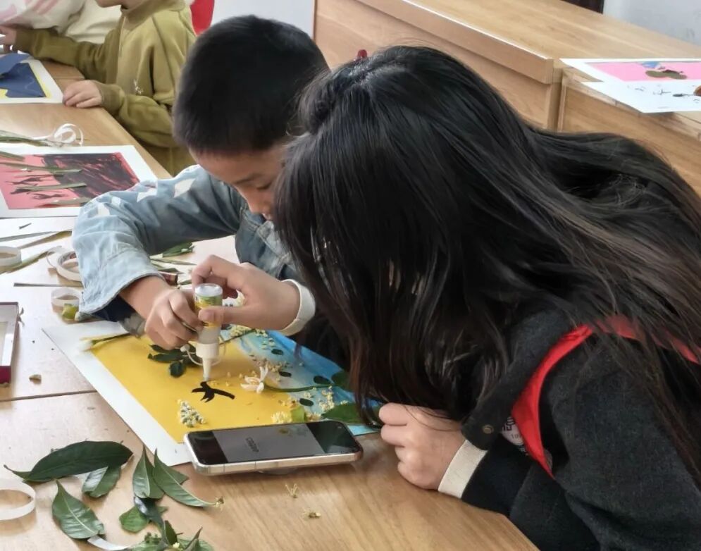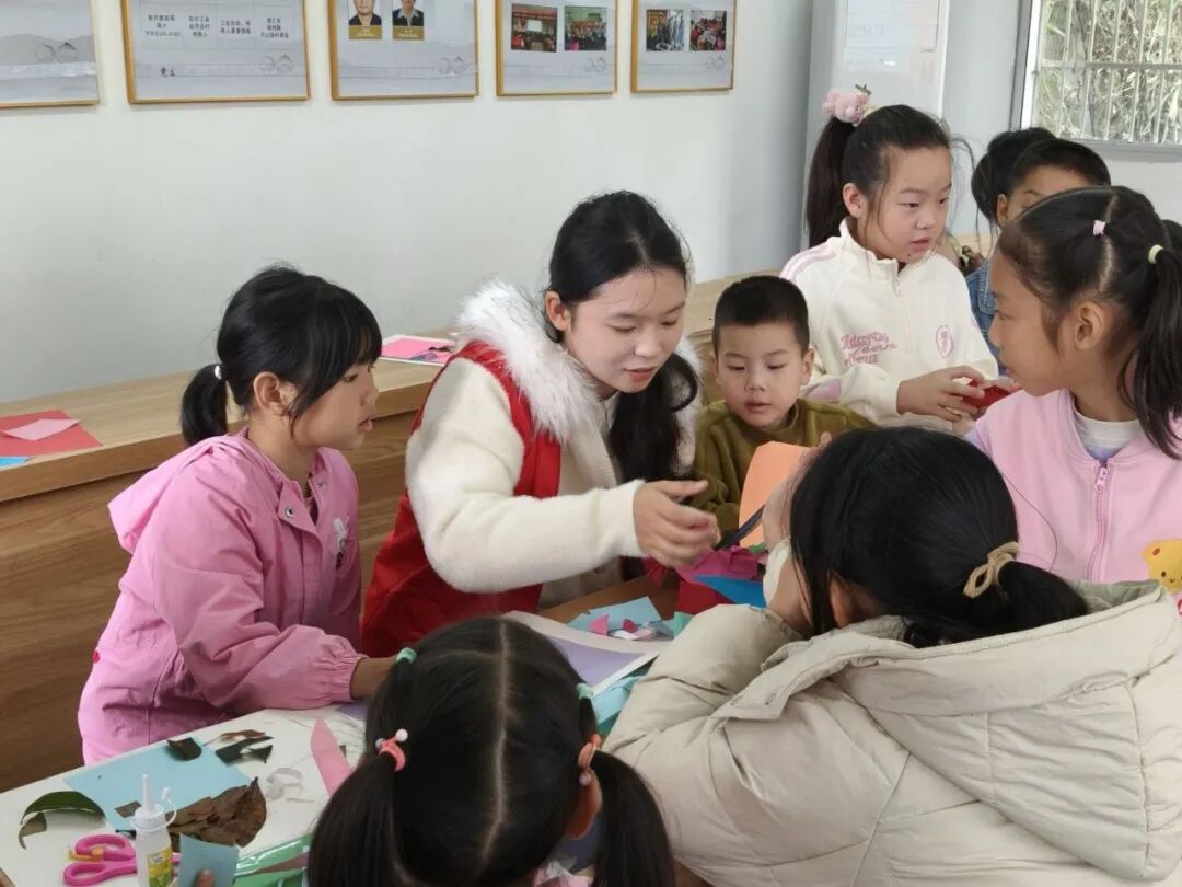 回到课堂,手工创作环节热闹开启。志愿者先展示了树叶贴画的创意示例,随后孩子们化身 “小小艺术家”, 创作中,志愿者们耐心指导,和孩子们一起把乡村的秋意变成了一幅幅创意作品。