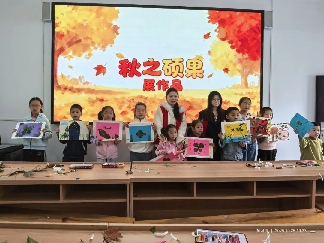 “我的作品叫《霜降的柿子树》,因为奶奶说吃柿子会很幸运!”“我做的是《山行》里的红叶,还有小鸟在飞呢!” 在 “秋之硕果” 作品展示环节,孩子们举着自己的树叶贴画,兴奋地分享创作故事。看着“希望书屋”的 “成果墙” 上挂满五彩作品,志愿者和孩子们脸上洋溢着笑脸。