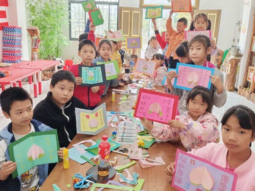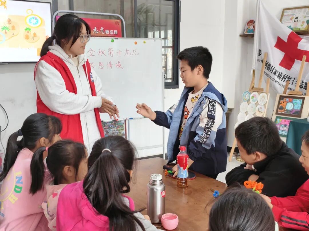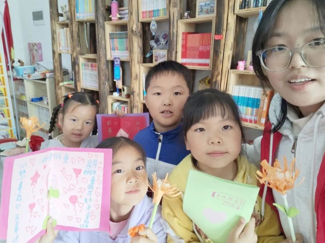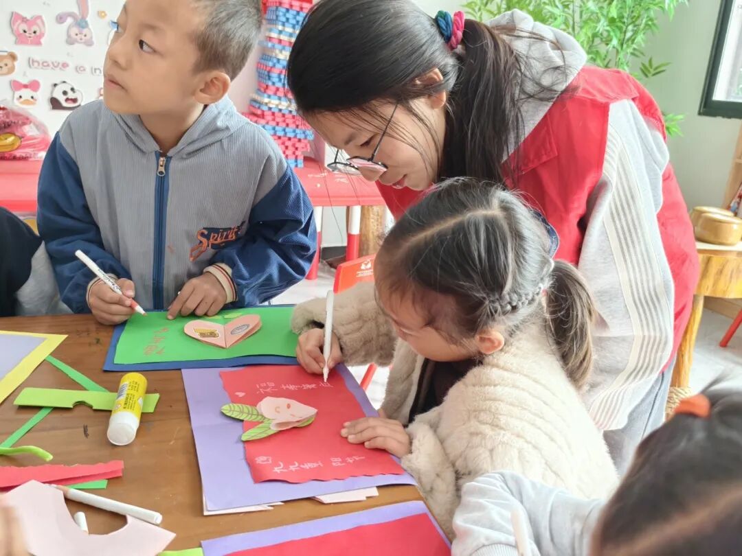 志愿者们与孩子们亲切互动,耐心指导手工技巧,及时给予鼓励夸赞。孩子们的笑声回荡在教室,一张张稚嫩的脸庞上满是专注与喜悦。当孩子们拿着亲手制作的贺卡和纸菊,骄傲地展示成果时,那份成就感与幸福感格外动人。活动最后,志愿者们鼓励孩子们将这份心意带回家,送给家中长辈,并给他们一个大大的拥抱。希望通过这次活动,能在孩子们心中播撒“敬老孝亲”的理念,让他们懂得爱要大声说出来,更要付诸于行动——为长辈做一件力所能及的小事,便是对“孝”最好的诠释。