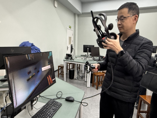 队伍一行还参观了AI智能实训微格教室、三字一话实训室、教学研究实训室、摄影摄像实验室、专业配音室和视频教学资源创作实训室等用于师范生教学基本技能训练的实训室。在参观混合现实教学实训室、虚拟现实教学实训室和虚拟教学资源实训室中,实验员介绍了关键虚拟设备,演示了设备使用,现场观众体验了虚拟结合的强烈效果,这系列实训室有力支撑了师范生教学基本技能提升。