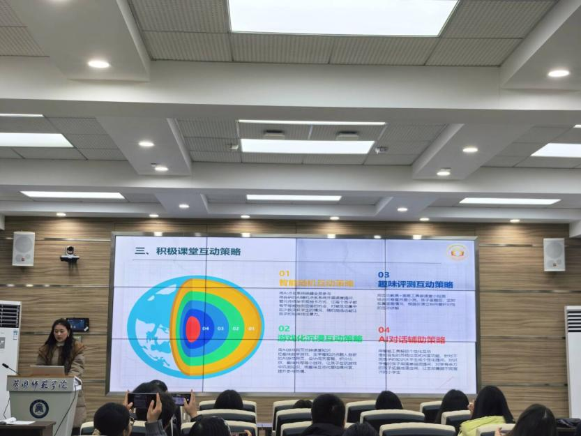 活动中,孙婷老师分享了积极课堂管理策略。她通过现场演示,重点介绍了智能随机互动、游戏化沉浸互动、趣味评测互动及AI对话辅助四大方法,将科技融入课堂管理,实用而生动,让同学们直观感受到高效课堂的构建技巧。