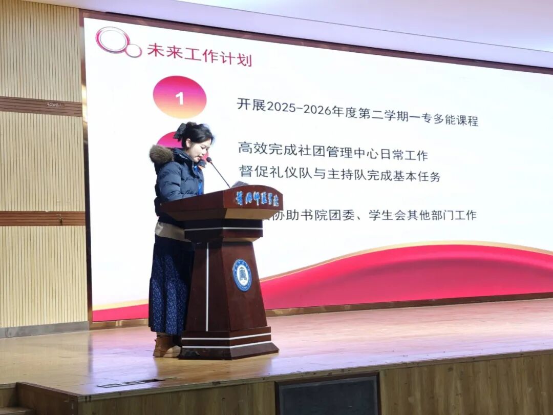 会议首先进行了团委、学生会各部门(中心)及主持队的年度工作总结汇报。办公室(综合事务部)、组织部、宣传部、第二课堂中心、社团管理中心、青年实践中心、青年艺体中心、权益保障部、学习科创部、心理健康部、纪检部及主持队负责人依次上台,围绕本年度工作开展情况、取得成果与不足反思进行汇报。各部门汇报内容扎实、条理清晰,全面展现了一学年来团学组织在各项工作中的积极作为与持续进步。